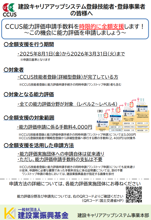 支援内容: ・能力評価申請手数料(4,000円)が全額支援(実質無料)